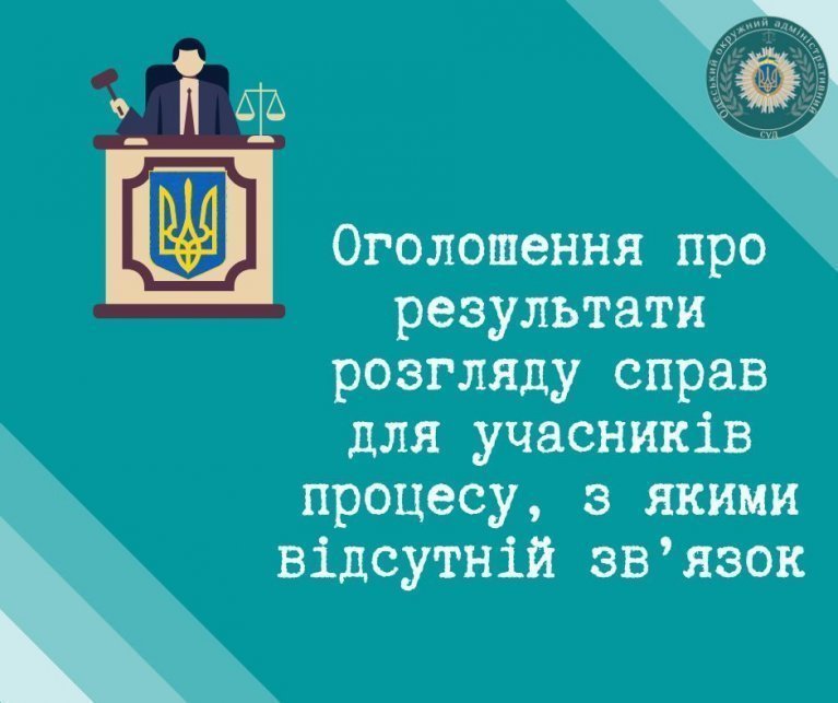 У зв’язку із обмеженістю в Одеському окружному адміністративному суді кошторисних призначень для сплати послуг поштового зв’язку та відсутністю реєстрації сторін у підсистемах «Електронний суд», «Електронний кабінет», а також не зазначення ними адреси електронної пошти, номеру телефону для зв’язку, що унеможливлює своєчасне направлення їм інформації та копій прийнятих рішень, повідомляємо про результати розгляду таких справ.