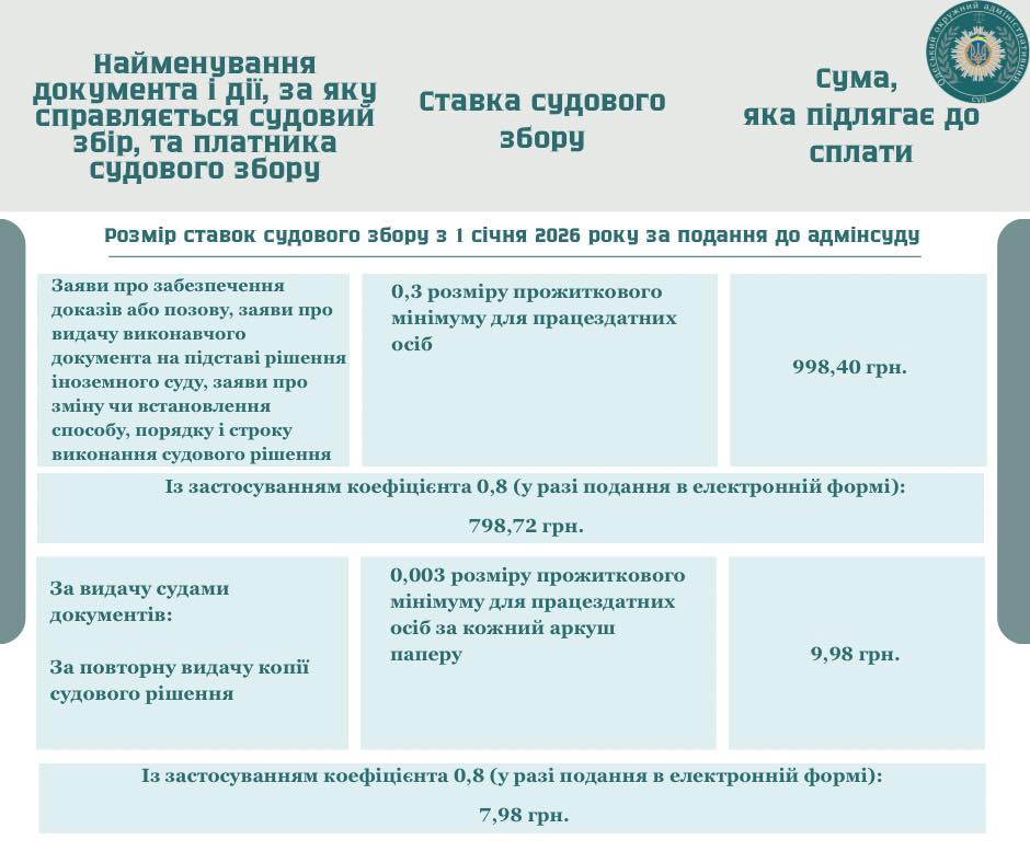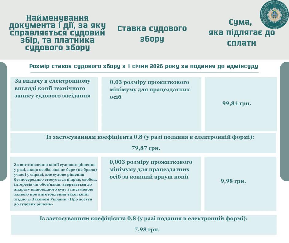 З 1 січня 2026 року змінено ставки судового збору