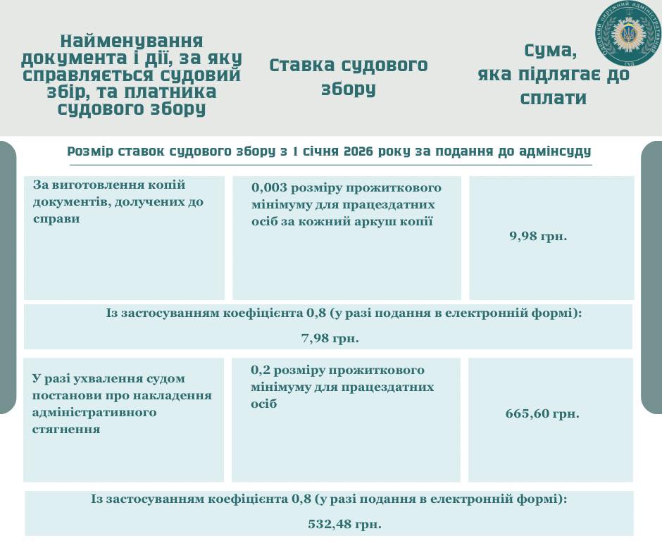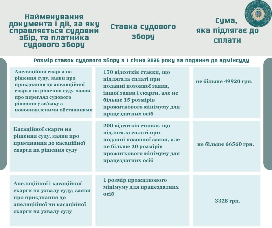 З розмірами судового збору, який буде справлятись у 2026 році, можете ознайомитись детальніше, переглянувши інфографіку.